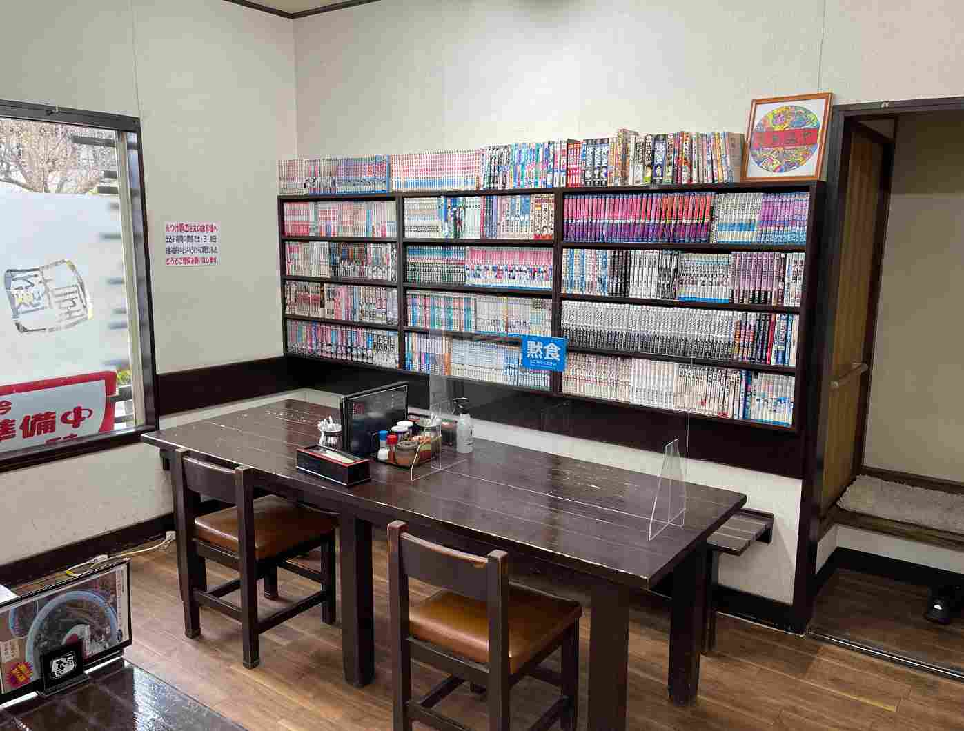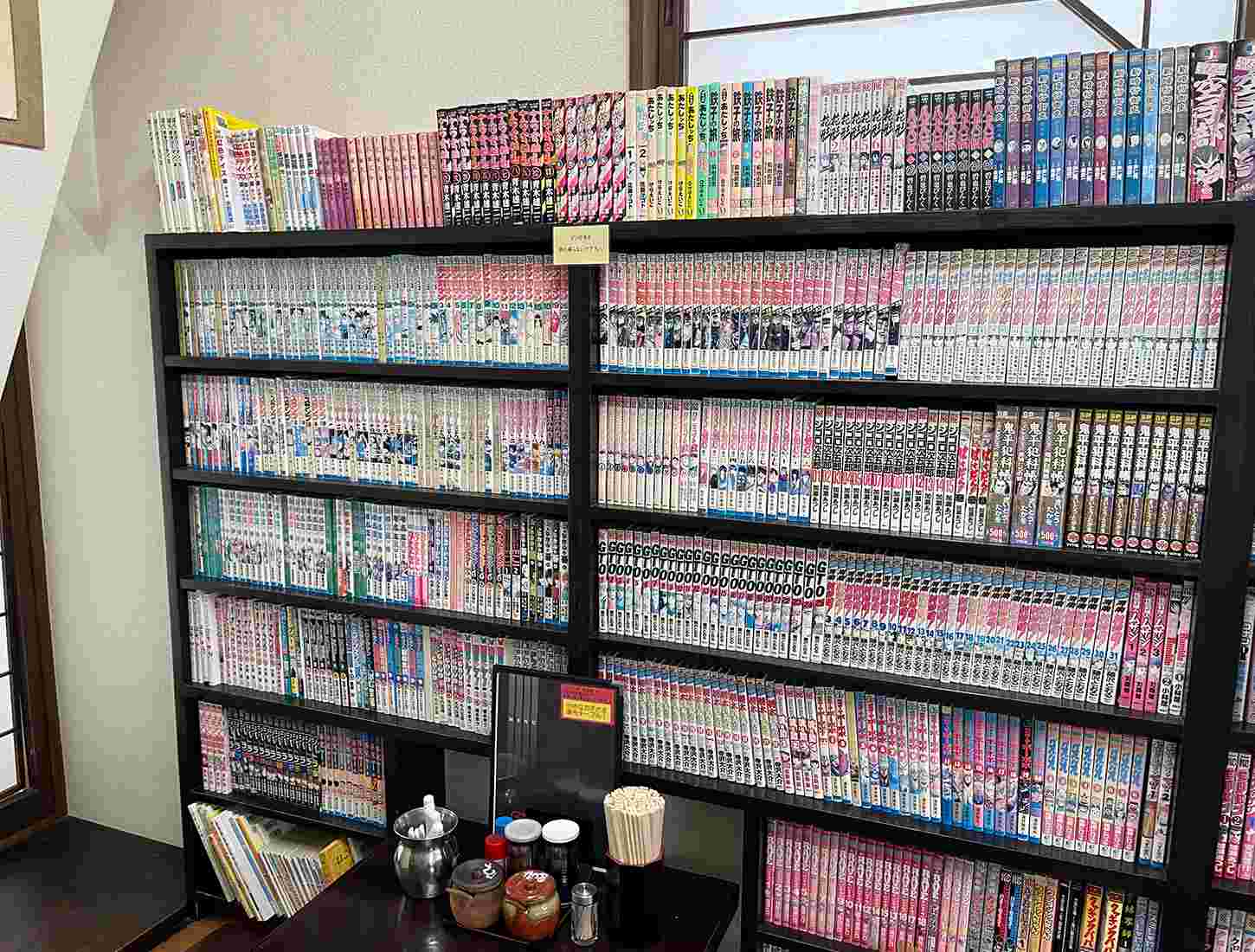 極太麺の「つけ麺」等をご注文されたお客様には、商品ご提供までの待ち時間も楽しいひとときを過ごしていただけるように、店内にマンガ本を置いております。